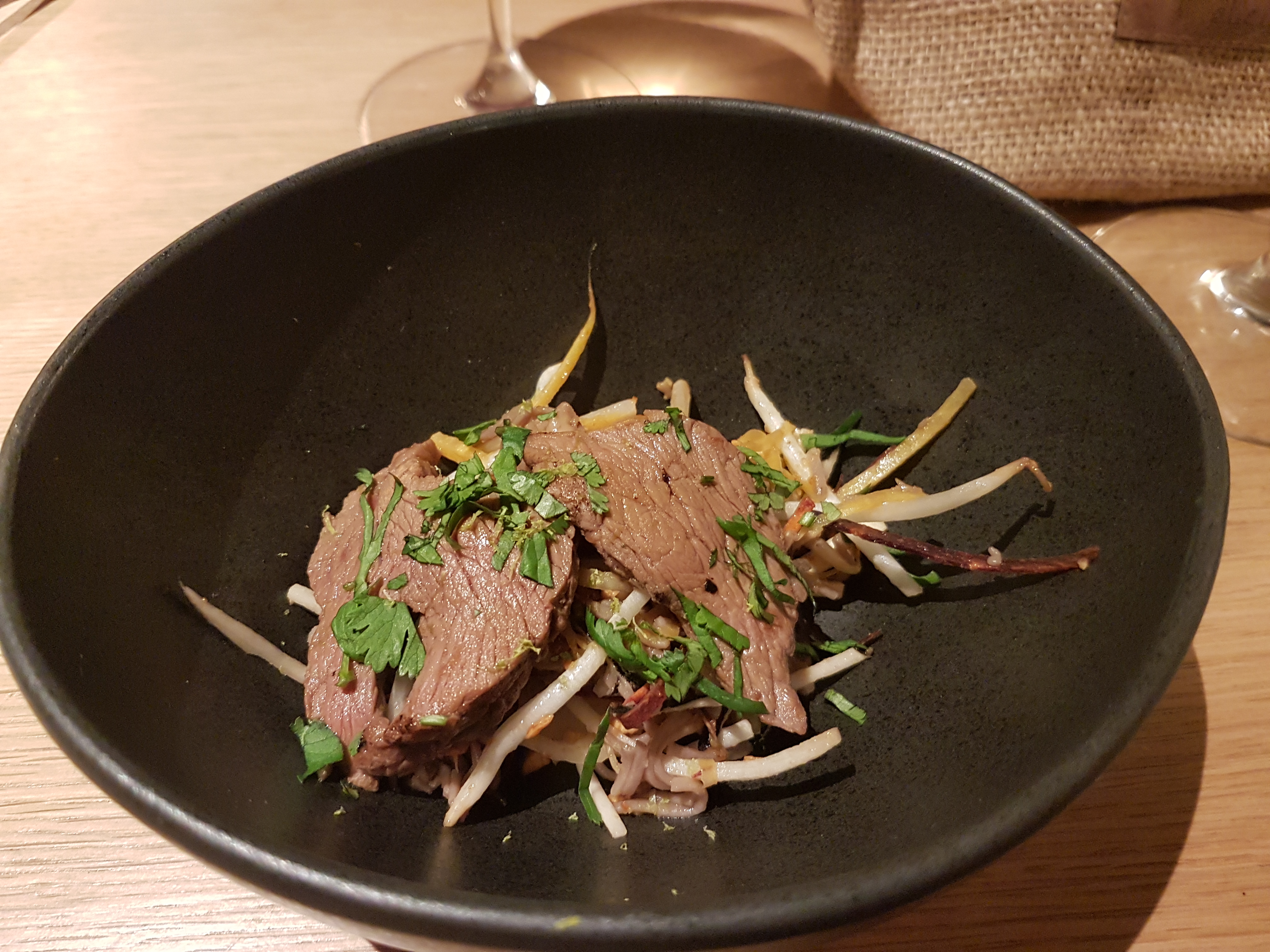 - entrée: langue de chat émincé – nouilles soba/ chou blanc / carottes – sauce soja sucrée – cacahuètes torréfiées, coriandre