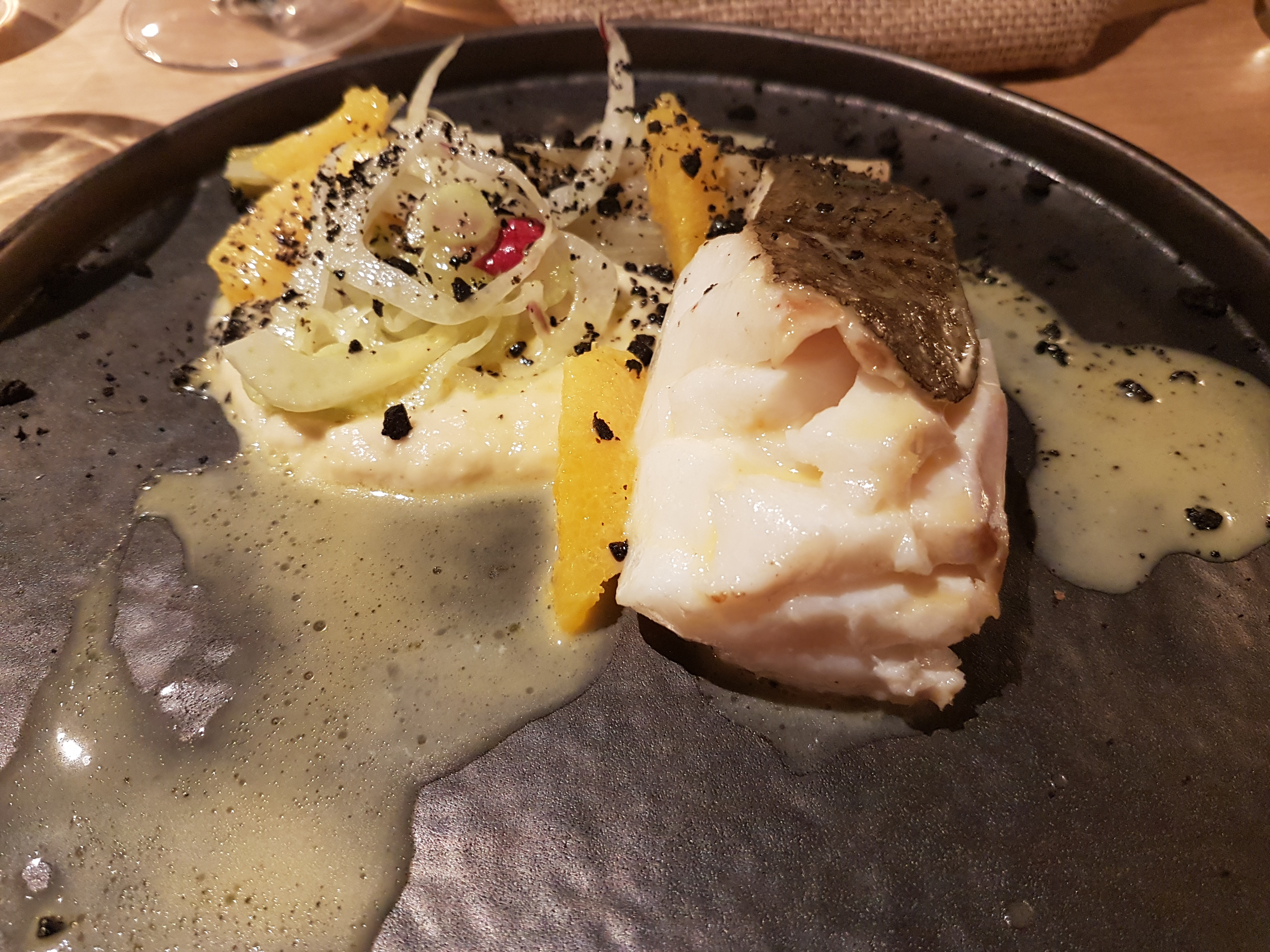 - plat: pêche du moment, mousseline de fenouil , copeaux de fenouil – condiment graine de lin/sésame/fenouil- beurre d’orange, suprêmes d’oranges et zestes