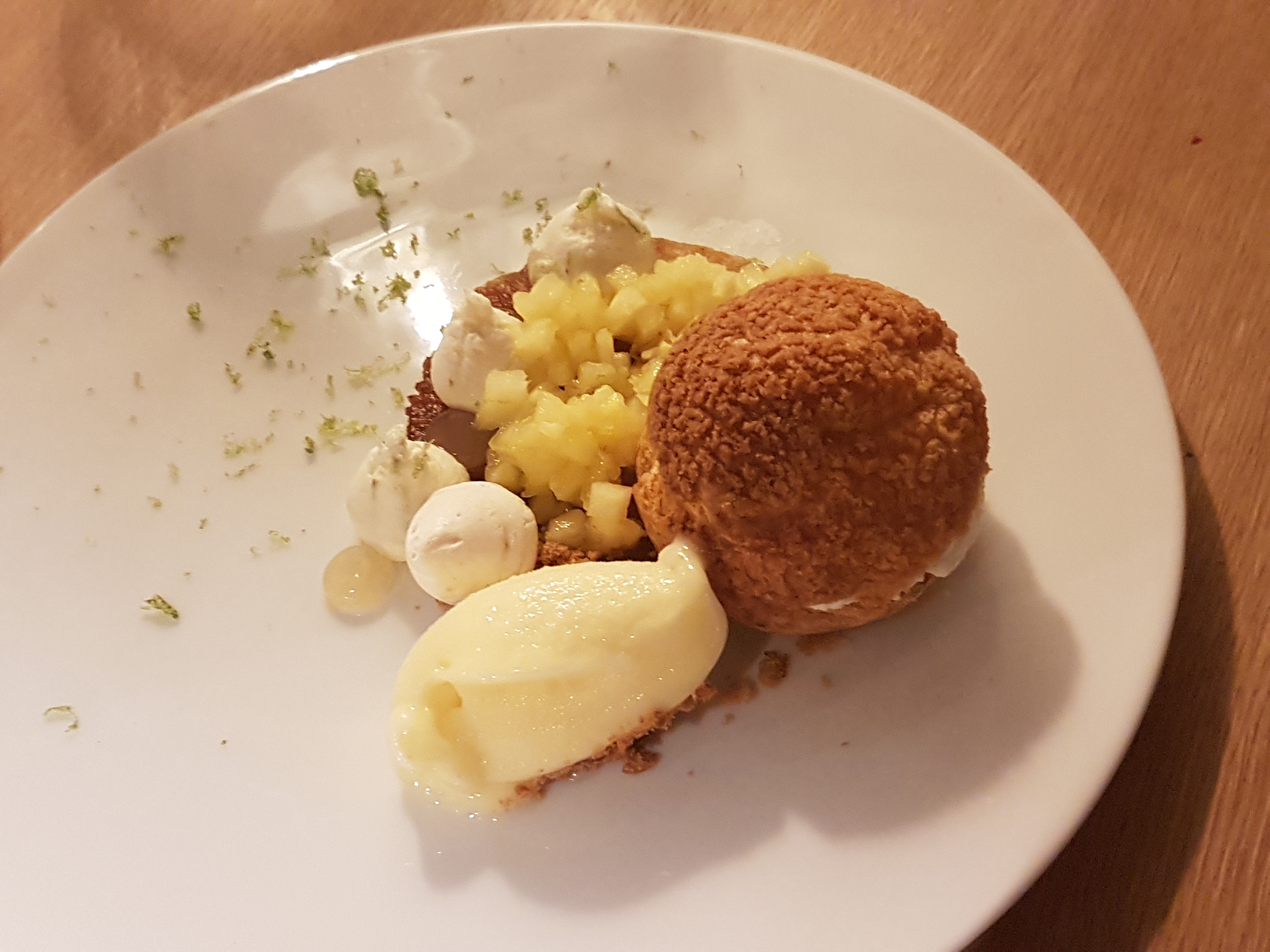 Apparemment il y a toujours un dessert avec un légume à la carte. Pour ma part, j’ai été la seule à oser tester le panais, chocolat blanc, granny smith et amandes. Les autres sont partis sur des assemblages que l’on connait mieux: tarte au chocolat/ fruit de la passion ou ananas /chou pâtissier / citron vert. Je suis contente d’avoir osé, le tout se mariait très bien, le côté onctueux du chocolat blanc avec un sorbet de granny smith et le goût du panais, parfaite combinaison, étonnant mais très équilibré en saveurs.