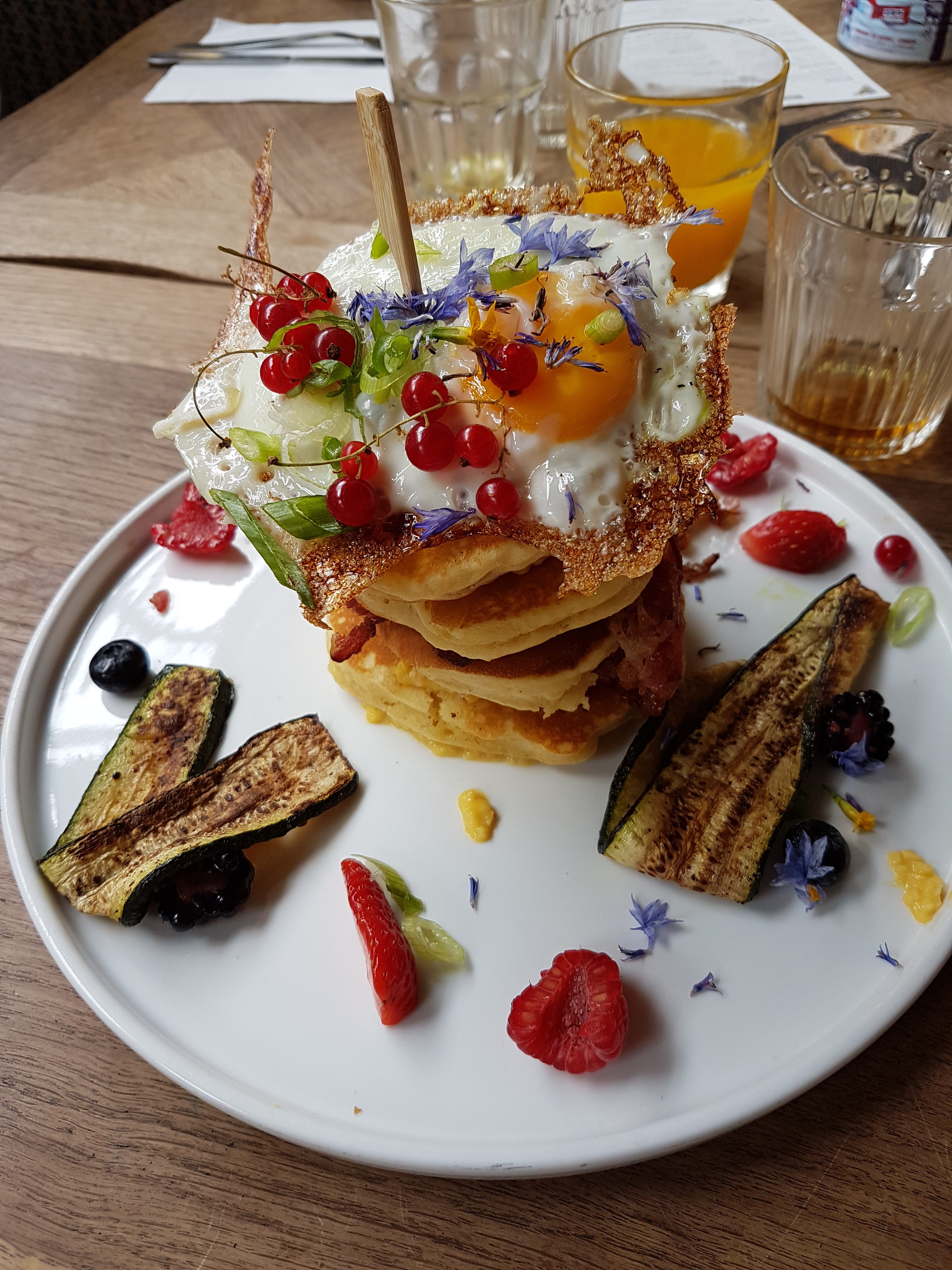 Le lieu est agréable, la déco est un peu éclectique, il y a de l’espace, le staff super très sympa, nous avons vraiment passé un bon moment. Ce qui m’a frappé c’est le nombre d’options de brunchs différents : il y en a une petite dizaine, pour tous les budgets, toutes les faims et tous les goûts. Personnellement j’ai opté pour la pancake tower et je me suis régalée! Cette montagne de pancake est assez indécente mais j’en suis arrivée à bout.